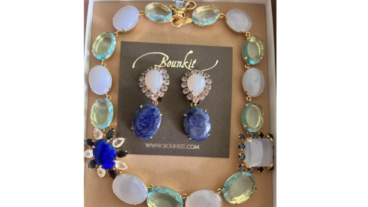 Lapis Lazuli, Chalcedony, Amethyst and other semi-precious gems adjustable necklace and matching convertible clip-on earrings set on vermeil.
