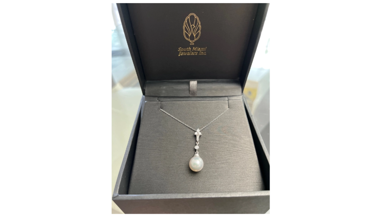 Solitaire cultured pearl and diamond platinum necklace from South Miami Jewelers. Platinum strand size 16 length with 5=.25Tw round diamonds and 10Tw cultured pearl.